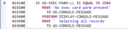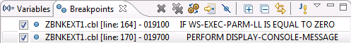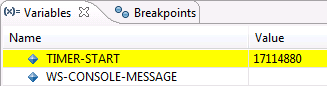The PERFORM statement executes and takes you to the line starting with IF TIMER. You can also see that a Variables view is now open in the IDE showing the current value of a data item on the line of code which is about to be executed.