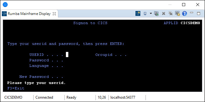 - 組み込みメインフレーム ディスプレイのヘルプを開きます。組み込みRumba Mainframe Display ビューの使用方法の詳細については、以下のリンクを参照してください。