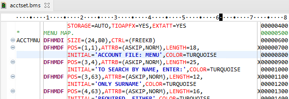 BMS コード領域は列 1 から 71 の間です。BMS 画面の名前は、最初の 7 文字 (列 1 から 7) を占めます。続いてスペースおよびマクロ名が列 9 から始まり、マクロ属性が列 16 から始まります。長い行は次の行に表示され、継続文字