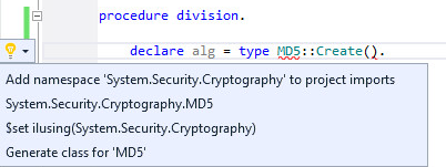 IDE に型に関する情報がない場合、エラー メッセージ COBCH0845 といくつかの解決方法の候補を含むポップアップ メッセージが表示されます。このクイック アクションを使用して、ネームスペースをインポートするプログラムの先頭に $set ilusing 文を追加します。