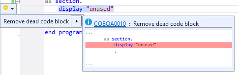 コード内に実行されない文がある場合は、[Micro Focus Code Analysis] ウィンドウに報告されます。