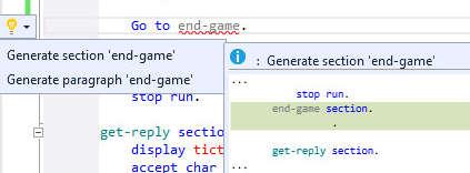 IDE にコード内の節または段落の位置に関する情報がない場合、メッセージ COBCH0348 とともに、節または段落を生成するための電球クイック アクションが表示されます。