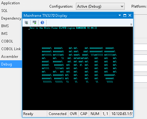 Visual Studio enters debug mode with a few new windows open in the IDE. The embedded Rumba display starts as well - if it is not started, click the mainframe TN3270 display icon,