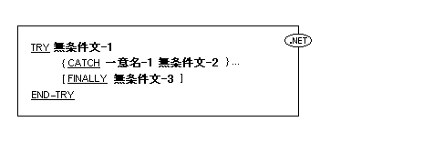 - 命令文-1の実行期間中に例外が発生した場合、各CATCH指定が指定された順序で、一意名-1が処理が実行された例外のクラスの下位のクラスであるか同等のクラスものである、指定が見つかるまで、調べられる。そのような 一意名-1が見つかった場合、それと関連した命令文-2が実行される。実行は、命令文-2で指定された各文に対する規則にもとづき、継続する。明示的な制御の移転を引き起こす、制御の分岐文または条件文が実行された場合、制御は、その文に対応する規則に従って移転される。それ以外では、命令文-2の実行完了後、指定されている場合は、命令文-3に、またはTRY文の終わりに、制御が移される。