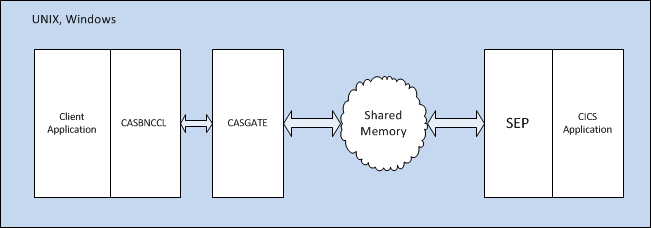 CICSEXTERNALCALL などの ECI エントリ ポイントは、Windows ではダイナミック ロード ライブラリとして、UNIX と Linux プラットフォームでは呼び出し可能共有オブジェクトとして提供される、casbnccl モジュールによって公開されます。