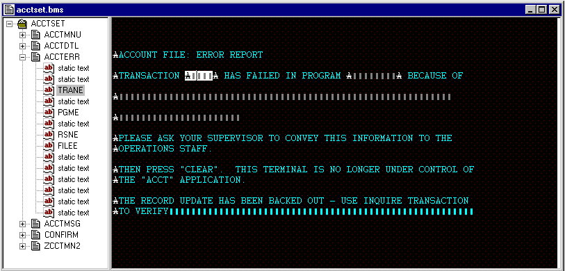 ペインタ ウィンドウの右側のペインには、編集中のマップを使用する CICS トランザクションによって端末画面に表示される場合と同じように、そのマップの内容が表示されます。右側のペインでは、フィールドの追加、フィールドの削除、個々のフィールドまたはフィールドのグループの移動およびコピーを行うことができます。また、テキスト付きのフィールドを初期化し、それらのフィールドで入力を受け付けるかどうかを定義することもできます。右側のペインでマップを編集している間は、左側のペインのツリー ビューが常に更新され、編集中のフィールドが強調表示されます。