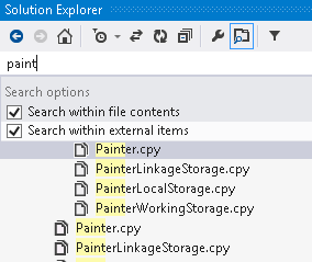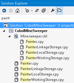 - ソリューション エクスプローラーの検索フィールドを使用して、ソリューションのファイルを検索できます。また検索によって、コピーブック依存関係ビューでコピーブックを (それらがソリューションでどのプロジェクトにも属さない場合も) 探すことができます。