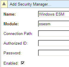 - [Name] フィールドに名前 (Windows ESM など) を入力し、[Module] フィールドに「osesm」と入力して、セキュリティ マネージャーを指定します。[Enabled] チェックボックスがオンになっていることを確認し、[Add] をクリックしてセキュリティ マネージャーを追加します。