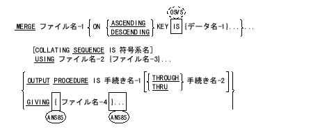 MERGE 文は、指定されたキーの組に従って同じようにそろえられているいくつかのファイルを、1つのファイルに併合する。そして、併合された順番に従って、出力手続きまたは出力ファイルへレコードを引き渡す。