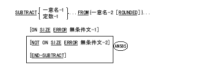 - 語FROMの前にあるすべての定数または一意名の和が取られ、一意名-2の現在の値からその和が差し引かれ、その結果が直ちに一意名-2に入れられる。語FROMの後ろに続く各作用対象に対して、それぞれ上記の処理が繰り返される。