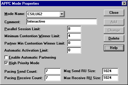 12. Select Close to complete the Mode definition. The new Mode should appear in the Modes pull-down window when choosing a mode for a Local LU - Remote LU partnership.