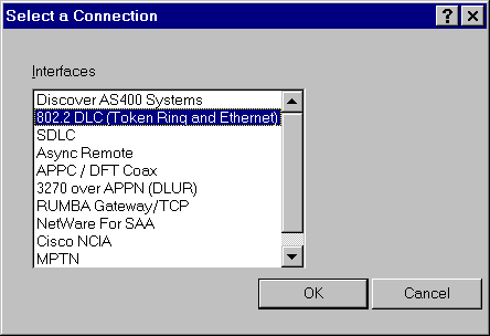 Select Connections by clicking in the Connections portion of the configuration window, then click the Add button. The Select a Connection window will appear. Select the type of physical network connection which will be used, in this case 802.2 DLC (Token Ring and Ethernet) and select OK. If you are using an alternative network connection type, such as SDLC or DFT Coax for instance, ensure that you have already installed a device driver for the network adapter.