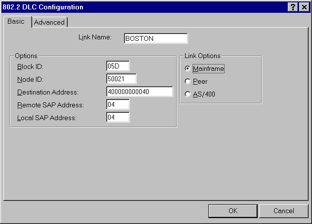 In the 802.2 DLC Configuration dialog box, select the Advanced tab by clicking on it and enter the following parameter settings: