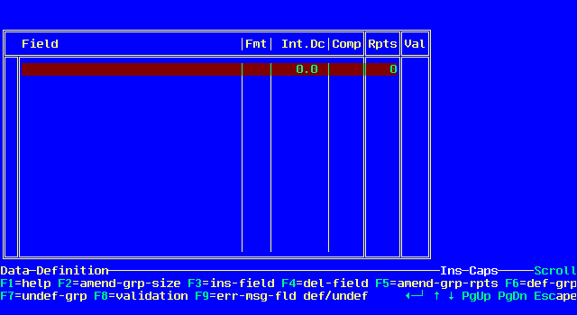 When you access the Data Field Definition function, the cursor appears on the first line of the list of data fields. For a new screenset, you can simply type in the appropriate data, using Tab to move from the Field column to the Fmt column. The cursor automatically skips from the Fmt column to the Comp column. The Rpts column is displayed, but you cannot access it. To access this column, you use the Define Group function described later in this chapter. When you have finished entering the details for a data field, press Enter to move down to the next line and repeat the process to specify the details for another data field. There is a maximum of 512 data fields per screenset.