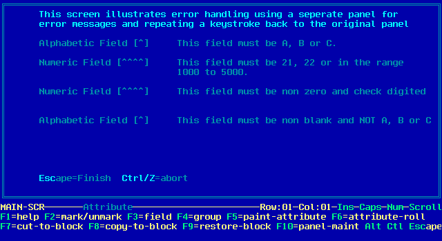 There are two final things to do before you can use any of the above effectively; create a field in the Data Block that the error message can be moved to, and position the field on the appropriate panel.