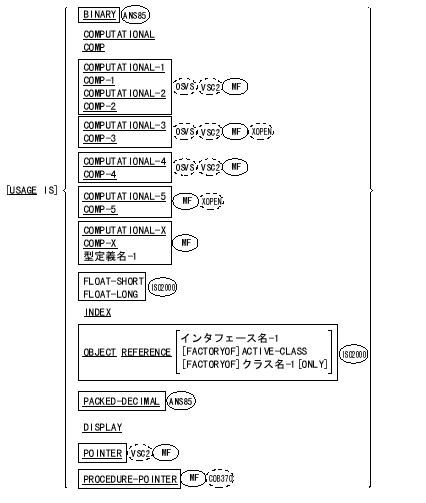 宣言にUSAGE句を持たない基本データ項目が、宣言にUSAGE句を持つ集団項目に従属する場合、そのUSAGE句は、英字、英数字、英数字編集、数字編集のデータ項目を定義したPICTURE文字列で記述されたリストの形式で記述してもよい。
