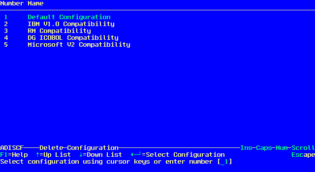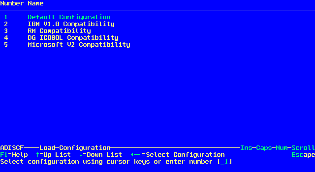 The ADISCTRL file that is supplied with your COBOL system contains a number of configurations that are set up to emulate different dialects of COBOL. Most of the time you do not need to do anything other than use the Adis Configuration utility to select which one of these configurations you wish to use (use the Choose option on the main menu of the Adis Configuration utility).