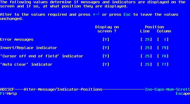 The Adis Configuration utility enables you to alter the default behavior of the enhanced ACCEPT and DISPLAY statements as described in your Language Reference
