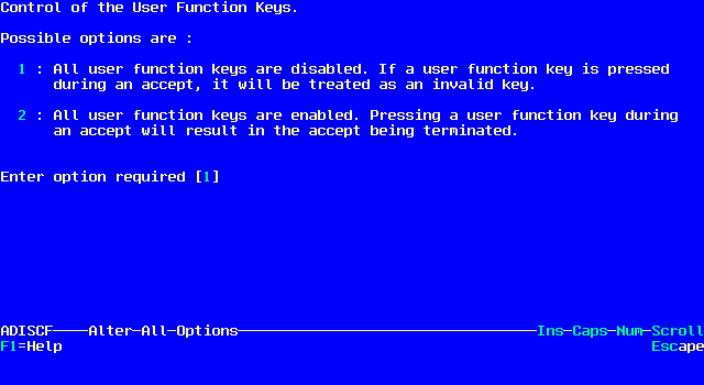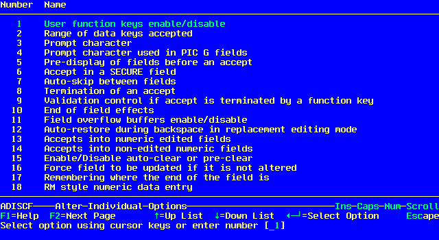 A description of that option and its current value is then displayed. To alter the value of an option, type the number of the choice you require at the relevant prompt and press Enter. Press Escape to return to the Alter Individual ACCEPT/DISPLAY Options menu. See the section ACCEPT/DISPLAY Options for a list of all available options.