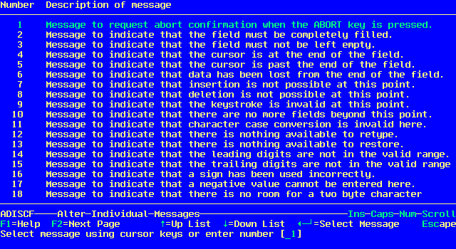 Displays a screen of messages you can change. The currently selected message is highlighted. Press F2=Next Page to see a page of further options, then press F2 again to return to the page of original messages. The first screen of message is shown in Figure 5-12 with the Alter Individual Messages menu.