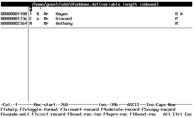 The record details are displayed on the status line. These include: