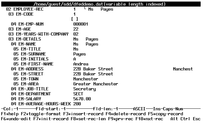 When you load a file, the Data Editing screen displays record details and the file contents. The Structure Selector screen enables you to specify the record format (see the section Structure Selector later in this chapter).