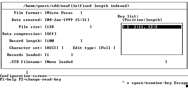 You can obtain information about the file at any time by pressing F10=file-info on the Alternate menu. This displays the Configuration Screen. Details of the current file are displayed. If the file is indexed, you can examine or change any key by selecting it in the key list and pressing space.