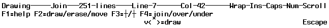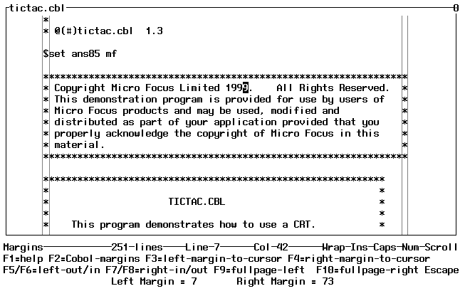 You can also use columns 73 onwards for comments you want to include in your program. Since the default margin settings are 7 and 73, you use the cursor keys (<left-arrow>, <up-arrow>, <right-arrow> and <down-arrow>) or Home and End keys to move into these two areas. You can change the default settings of the right and left margins so that you can use the Editor to create and view other types of files; this is described in the sections Entering Text and Configuring the Editor. Text lines of up to 250 characters can be created and viewed in an edit window.