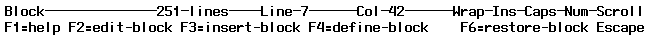 The role of function keys can vary according to the particular menu displayed. However, one function key carries the same function throughout the Editor system. This is the F1=help option. When you press F1 from any menu, you access an on-line help system which displays information about the current function as well as defining the options available from that function. If there is more than one screen of help text, pressing F1 again displays the next screen. To return to the current function from the help screen, press F1 (from the last screen) or the Space bar.