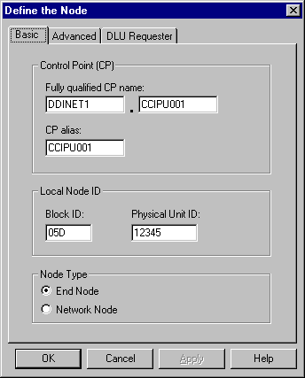 1. In the Fully Qualified CP name enter the Network Name for this SNA network in the first box. This should be obtained from the network administrator of the host system. In the second box following the period enter the Control Point (CP) name assigned to this machine. This should be obtained from the network administrator of the host system. The CP Name should match the Physical Unit (PU) name assigned to this machine as specified in the PU definition in VTAM for this machine.