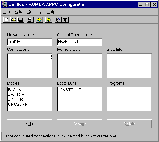11. Select OK to complete the definition of the connection. The new connection should appear in the Connections window of the RUMBA APPC Configuration window.
