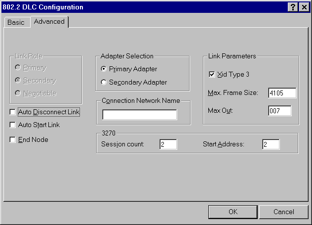In the 802.2 DLC Configuration dialog box, select the Advanced tab by clicking on it and enter the following parameter settings: