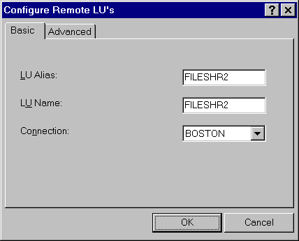 1. Select Remote LU's by clicking in the Remote LU's portion of the configuration window, then click the Add button. The Configure Remote LU's window will appear.