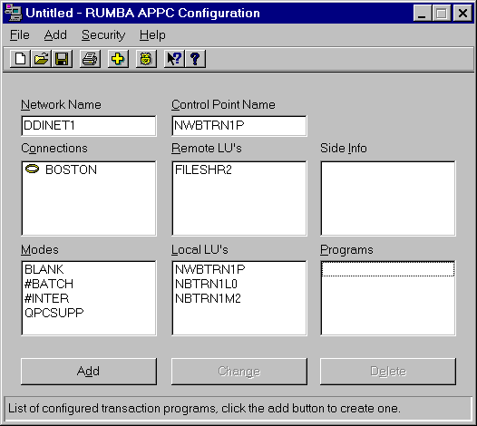 After successfully installing the Rumba Office 95/NT product, you can start to configure your APPC connection. You should have a VTAM definition of the connection you are attempting to configure available to you during the configuration. Select Start from the Taskbar, then Programs, then Rumba 95 NT Folder, then Rumba Administrative Tools, then APPC Configuration. The APPC Configuration window will be displayed. A sample window with a full configuration is displayed below for reference. Your window will have some default values filled in, you can override these and configure your own connection using the instructions below.