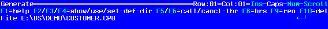Pressing F8=brs from the Generate Prompt Ctrl menu enables you to view the specified file's copyfile, as long as copyfile is in readable text format. To browse a file in a library, specify path\library-name.lbr\filename. Use the PgDn, <down-arrow>, or Enter keys to move forward through the file. Press Escape to return to the Generate Prompt menu.
