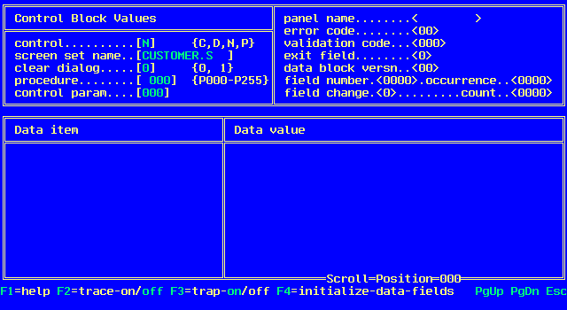 Pressing F4=initialize-data-fields from the Trap Screen menu initializes all numeric fields in the Data Block to zero and all other fields to spaces. You can view this in the trap data field display in the lower part of the trap screen.