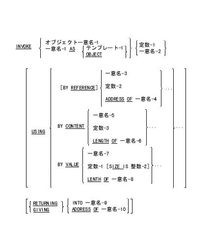 - 呼出し対象のメソッドがCOBOLものである場合、そのメソッドの手続き部の見出し内にUSING指定がある場合にのみ、INVOKE文にUSING指定が含められる。その場合、USING指定内の作用対象の数は同じでなければならない。INVOKE文内にRETURNING指定がある場合、呼出し対象のメソッドの手続き部の見出し内にRETURNING指定がなければならない。