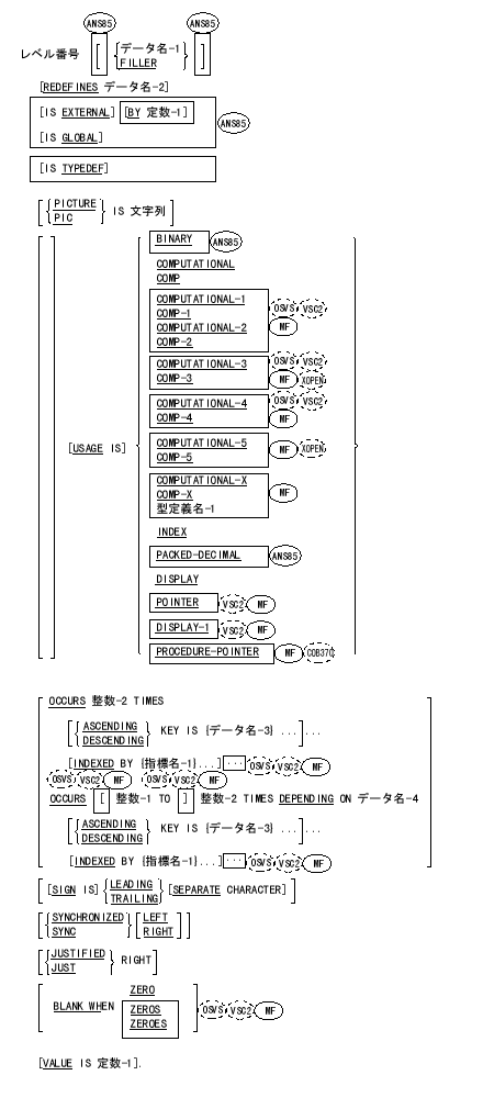 データ名(data-name)は、記述する対象のデータの名前を表わす。語FILLERは、レコード中の明示的に参照しない基本項目を指定するために使用する。