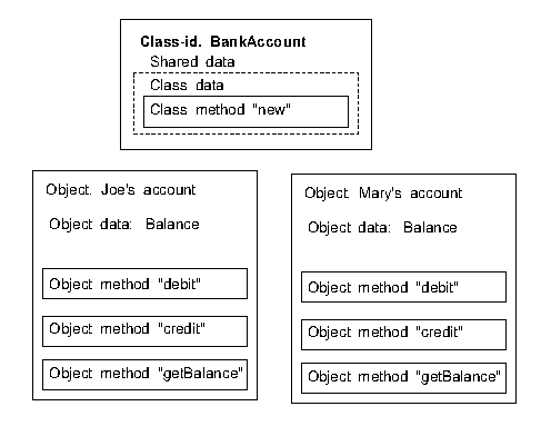 Many of the objects in an OO application represent objects in the real world. For example, a banking system would include objects to represent customers, accounts and ledgers. The attributes of an account would include the balance, and its methods would include Debit, Credit, GetBalance. Figure 2-1 shows two ways of representing such an object.