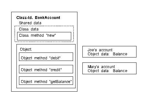In the Object COBOL class, the outer program contains all the attributes and methods specific to the class object. The object program contains the attributes and methods specific to each instance object. Figure 2-2 shows a class diagramatically.