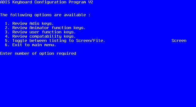 This menu enables you to list all currently defined function keys in one of four sets: Adis, Animator, user or compatibility. To output the list of your choice, press its associated number. For example, press 2 to output the list of Animator function keys, or 4 to output the list of compatibility keys.
