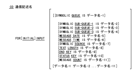 3. INPUT指定に補助語のTERMINALを付けないと、通信記述項の項目のうちデータ名-1(SYMBOLIC QUEUE)からデータ名-4(SYMBOLIC SUB-QUEUE-3)までの主待ち行列、および副待ち行列に関連するすべての発信源との論理経路が開通される。