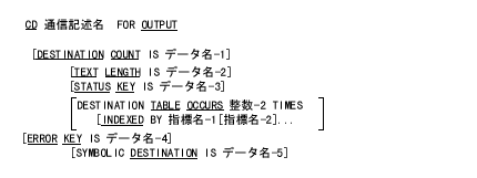 5. DESTINATION TABLE OCCURS句を指定しないと、ERRORキーとSYMBOLIC DESTINATIONがそれぞれ1つずつ確保される。この場合、それらのデータ項目を参照するときに、添字も指標も使用することはできない。