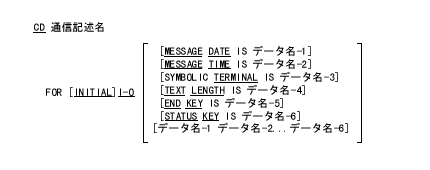 01 データ名-0. 02 データ名-1 PIC X(12). SYMBOLIC QUEUE 02 データ名-2 PIC X(12). SYMBOLIC SUB-QUEUE-1 02 データ名-3 PIC X(12). SYMBOLIC SUB-QUEUE-2 02 データ名-4 PIC X(12). SYMBOLIC SUB-QUEUE-3 02 データ名-5 PIC 9(06). MESSAGE DATE 02 データ名-6 PIC 9(08). MESSAGE TIME 02 データ名-7 PIC X(12). SYMBOLIC SOURCE 02 データ名-8 PIC 9(04). TEXT LENGTH 02 データ名-9 PIC X. END KEY 02 データ名-10 PIC XX. STATUS KEY 02 データ名-11 PIC 9(06). MESSAGE COUNT