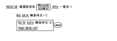 RECEIVE(受信)文は、通信文、通信行、通信文または通信行の一部、およびそれらのデータに関する情報を、通信管理システムによって保持されている待ち行列からCOBOLプログラムに引き渡す。該当するデータが何もないときは、無条件文を実行することができる。