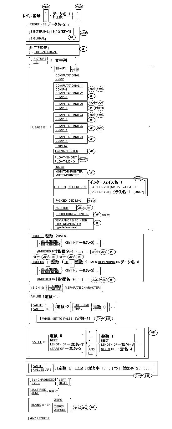 この付録では、このCOBOLシステムの構文を列挙する。この中には、Data General Interactive COBOL、 Ryan McFarland COBOL、Microsoft COBOLと互換性をもたせることだけを目的として用意されている構文は含まない。 これらの情報に関しては、COBOL言語リファレンス - 追加トピックのData General Interactive COBOL V1.3 構文支援機能、 Ryan McFarland COBOL V2.0 構文支援機能、Siemens BS2000 COBOL 構文支援機能 および Microsoft COBOL V1.0 and V2.0 構文支援機能の各章を参照。