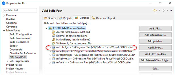 Eclipse 内の COBOL JVM プロジェクト タイプでは、ネイティブの Micro Focus ファイル ハンドラーがデフォルトで使用されます。プロジェクトのプロパティを表示すると、[JVM Build Path] 設定の [Libraries] タブで、COBOL JVM Runtime System ライブラリに含まれる mfcobol.jar への参照を確認できます。この jar ファイルにより、Java からネイティブの Micro Focus ファイル ハンドラーにアクセスできるようになります。