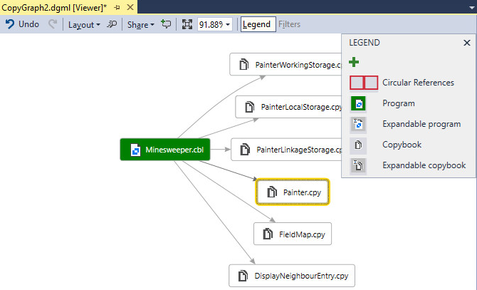 これにより、DGML エディターでファイルのコピーブック グラフが開き、ファイルのコピーブック依存関係が視覚的に表示されます。