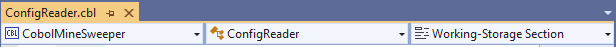 - COBOL エディターの最上部にあるナビゲーション バーには、現在のプロジェクトおよびファイルが表示され、現在のセクションと現在のプログラムで使用されているすべてのオブジェクトや手続きに加えて、手続き部、セクション、段落、グループ レベルのデータ定義を含むドロップダウン