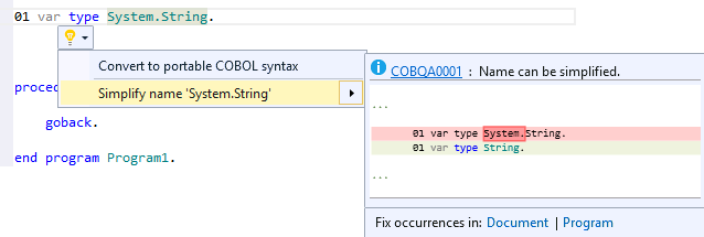 エディターで電球クイック アクション [Convert to portable COBOL syntax] を使用すると、.NET タイプを COBOL 事前定義タイプに自動的に置き換えることができます。
